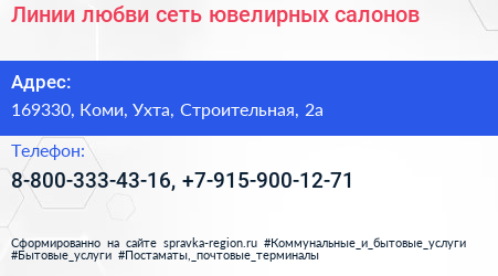 Линии любви, сеть ювелирных салонов по адресу 169330, Коми, Ухта, Строительная, 2а в дальнейшем Организация, размещена в следующих категориях: