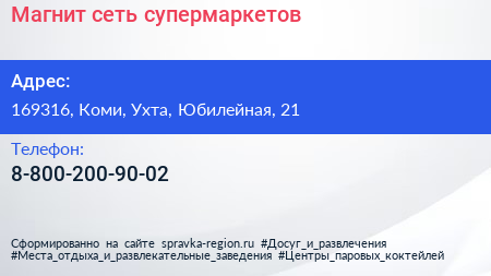 Магнит, сеть супермаркетов по адресу 169316, Коми, Ухта, Юбилейная, 21 в дальнейшем Организация, размещена в следующих категориях: