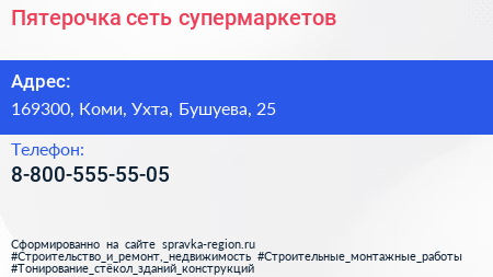 Пятерочка, сеть супермаркетов по адресу 169300, Коми, Ухта, Бушуева, 25 в дальнейшем Организация, размещена в следующих категориях: