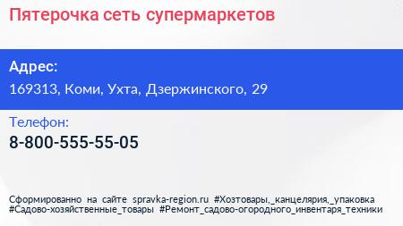 Пятерочка, сеть супермаркетов по адресу 169313, Коми, Ухта, Дзержинского, 29 в дальнейшем Организация, размещена в следующих категориях: