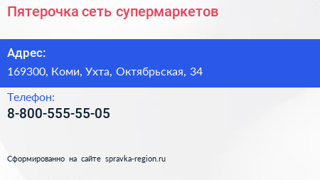 Пятерочка, сеть супермаркетов по адресу 169300, Коми, Ухта, Октябрьская, 34 в дальнейшем Организация, размещена в следующих категориях: