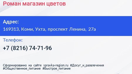 Роман, магазин цветов по адресу 169313, Коми, Ухта, проспект Ленина, 27а в дальнейшем Организация, размещена в следующих категориях: