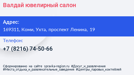 Валдай, ювелирный салон по адресу 169311, Коми, Ухта, проспект Ленина, 19 в дальнейшем Организация, размещена в следующих категориях: