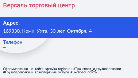 Версаль, торговый центр по адресу 169330, Коми, Ухта, 30 лет Октября, 4 в дальнейшем Организация, размещена в следующих категориях: