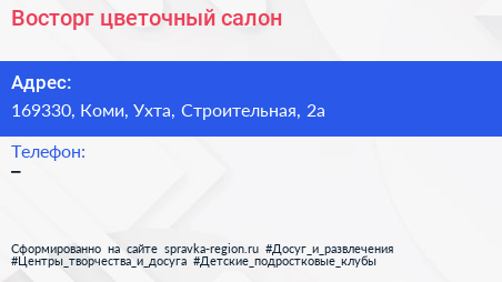 Восторг, цветочный салон по адресу 169330, Коми, Ухта, Строительная, 2а в дальнейшем Организация, размещена в следующих категориях: