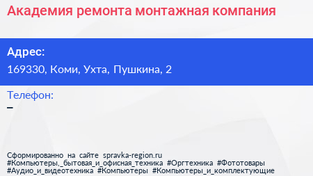 Академия ремонта, монтажная компания по адресу 169330, Коми, Ухта, Пушкина, 2 в дальнейшем Организация, размещена в следующих категориях: