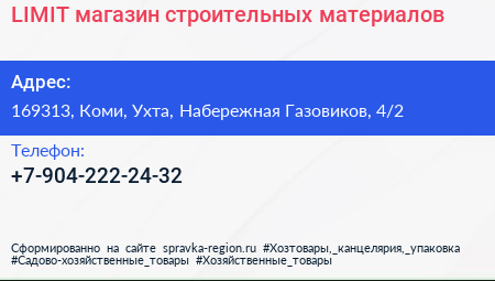 LIMIT, магазин строительных материалов по адресу 169313, Коми, Ухта, Набережная Газовиков, 4/2 в дальнейшем Организация, размещена в следующих категориях: