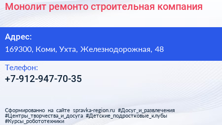 Монолит, ремонто-строительная компания по адресу 169300, Коми, Ухта, Железнодорожная, 48 в дальнейшем Организация, размещена в следующих категориях: