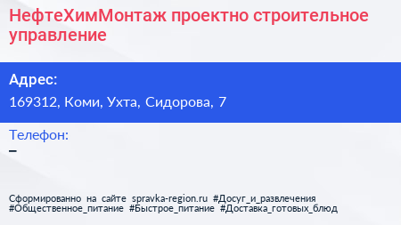 НефтеХимМонтаж, проектно-строительное управление по адресу 169312, Коми, Ухта, Сидорова, 7 в дальнейшем Организация, размещена в следующих категориях: