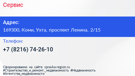 Сервис по адресу 169300, Коми, Ухта, проспект Ленина, 2/15 в дальнейшем Организация, размещена в следующих категориях:
