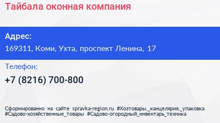 Тайбала, оконная компания по адресу 169311, Коми, Ухта, проспект Ленина, 17 в дальнейшем Организация, размещена в следующих категориях: