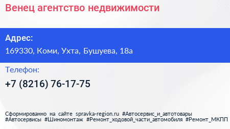 Венец, агентство недвижимости по адресу 169330, Коми, Ухта, Бушуева, 18а в дальнейшем Организация, размещена в следующих категориях: