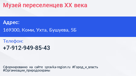 Музей переселенцев ХХ века по адресу 169300, Коми, Ухта, Бушуева, 5Б в дальнейшем Организация, размещена в следующих категориях:
