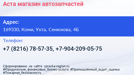 Аста, магазин автозапчастей по адресу 169330, Коми, Ухта, Сенюкова, 4Б в дальнейшем Организация, размещена в следующих категориях: