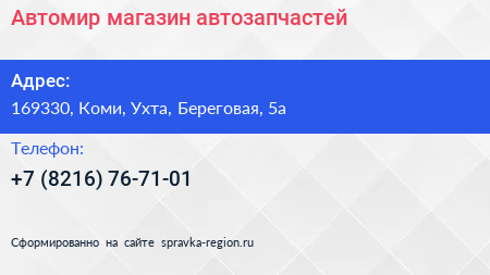 Автомир, магазин автозапчастей по адресу 169330, Коми, Ухта, Береговая, 5а в дальнейшем Организация, размещена в следующих категориях: