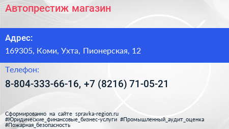 Автопрестиж, магазин по адресу 169305, Коми, Ухта, Пионерская, 12 в дальнейшем Организация, размещена в следующих категориях: