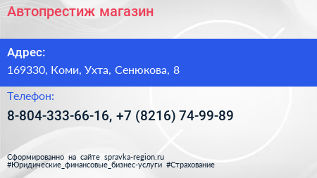 Автопрестиж, магазин по адресу 169330, Коми, Ухта, Сенюкова, 8 в дальнейшем Организация, размещена в следующих категориях: