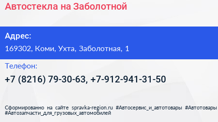 Автостекла на Заболотной по адресу 169302, Коми, Ухта, Заболотная, 1 в дальнейшем Организация, размещена в следующих категориях: