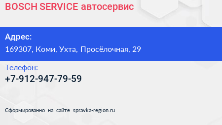 BOSCH SERVICE, автосервис по адресу 169307, Коми, Ухта, Просёлочная, 29 в дальнейшем Организация, размещена в следующих категориях: