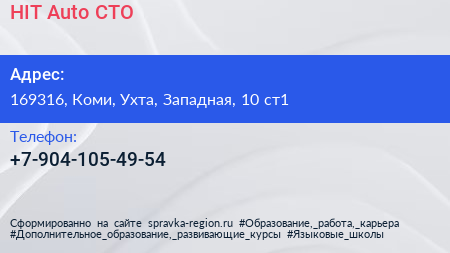 HIT Auto, СТО по адресу 169316, Коми, Ухта, Западная, 10 ст1 в дальнейшем Организация, размещена в следующих категориях: