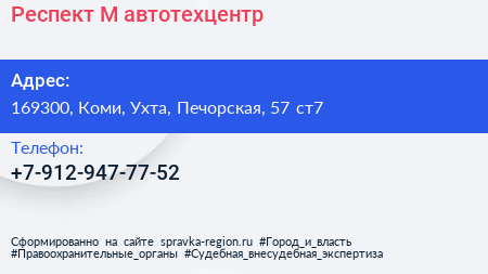 Респект-М, автотехцентр по адресу 169300, Коми, Ухта, Печорская, 57 ст7 в дальнейшем Организация, размещена в следующих категориях:
