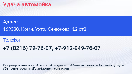Удача, автомойка по адресу 169330, Коми, Ухта, Сенюкова, 12 ст2 в дальнейшем Организация, размещена в следующих категориях: