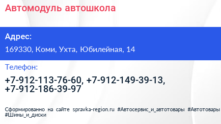 Автомодуль, автошкола по адресу 169330, Коми, Ухта, Юбилейная, 14 в дальнейшем Организация, размещена в следующих категориях: