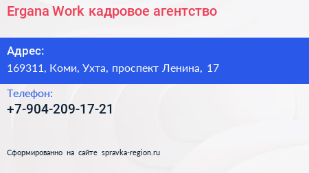 Ergana Work, кадровое агентство по адресу 169311, Коми, Ухта, проспект Ленина, 17 в дальнейшем Организация, размещена в следующих категориях:
