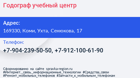 Годограф, учебный центр по адресу 169330, Коми, Ухта, Сенюкова, 17 в дальнейшем Организация, размещена в следующих категориях: