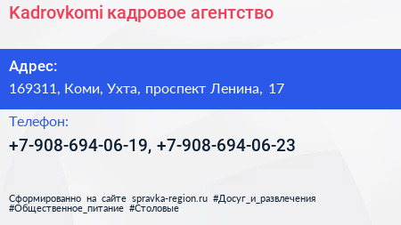 Kadrovkomi, кадровое агентство по адресу 169311, Коми, Ухта, проспект Ленина, 17 в дальнейшем Организация, размещена в следующих категориях: