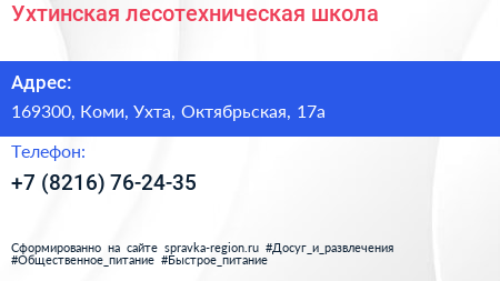 Ухтинская лесотехническая школа по адресу 169300, Коми, Ухта, Октябрьская, 17а в дальнейшем Организация, размещена в следующих категориях: