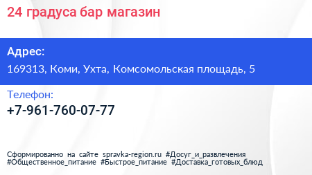 24 градуса, бар-магазин по адресу 169313, Коми, Ухта, Комсомольская площадь, 5 в дальнейшем Организация, размещена в следующих категориях: