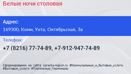 Белые ночи, столовая по адресу 169300, Коми, Ухта, Октябрьская, 3а в дальнейшем Организация, размещена в следующих категориях: