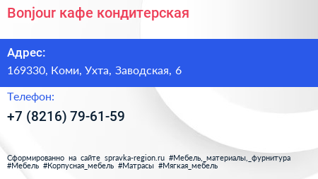 Bonjour, кафе-кондитерская по адресу 169330, Коми, Ухта, Заводская, 6 в дальнейшем Организация, размещена в следующих категориях: