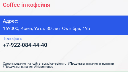Coffee in, кофейня по адресу 169300, Коми, Ухта, 30 лет Октября, 19а в дальнейшем Организация, размещена в следующих категориях: