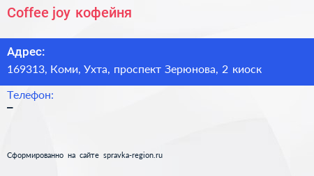 Coffee joy, кофейня по адресу 169313, Коми, Ухта, проспект Зерюнова, 2 киоск в дальнейшем Организация, размещена в следующих категориях: