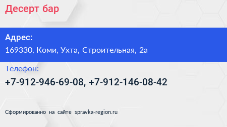 Десерт-бар по адресу 169330, Коми, Ухта, Строительная, 2а в дальнейшем Организация, размещена в следующих категориях: