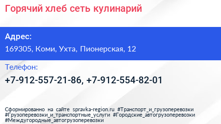 Горячий хлеб, сеть кулинарий по адресу 169305, Коми, Ухта, Пионерская, 12 в дальнейшем Организация, размещена в следующих категориях: