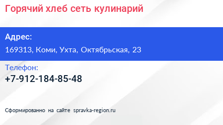 Горячий хлеб, сеть кулинарий по адресу 169313, Коми, Ухта, Октябрьская, 23 в дальнейшем Организация, размещена в следующих категориях: