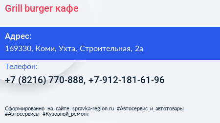 Grill burger, кафе по адресу 169330, Коми, Ухта, Строительная, 2а в дальнейшем Организация, размещена в следующих категориях:
