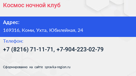 Космос, ночной клуб по адресу 169316, Коми, Ухта, Юбилейная, 24 в дальнейшем Организация, размещена в следующих категориях: