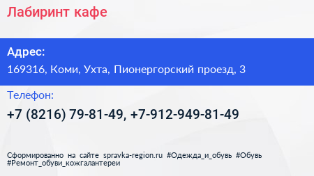 Лабиринт, кафе по адресу 169316, Коми, Ухта, Пионергорский проезд, 3 в дальнейшем Организация, размещена в следующих категориях: