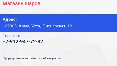 Магазин шаров по адресу 169305, Коми, Ухта, Пионерская, 12 в дальнейшем Организация, размещена в следующих категориях: