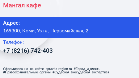 Мангал, кафе по адресу 169300, Коми, Ухта, Первомайская, 2 в дальнейшем Организация, размещена в следующих категориях:
