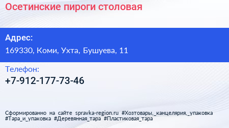 Осетинские пироги, столовая по адресу 169330, Коми, Ухта, Бушуева, 11 в дальнейшем Организация, размещена в следующих категориях: