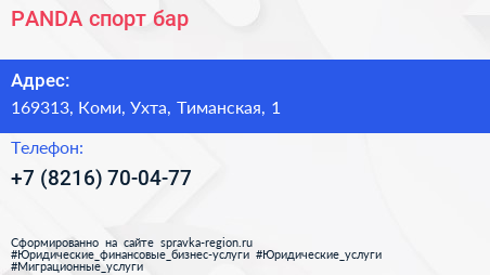 PANDA, спорт-бар по адресу 169313, Коми, Ухта, Тиманская, 1 в дальнейшем Организация, размещена в следующих категориях: