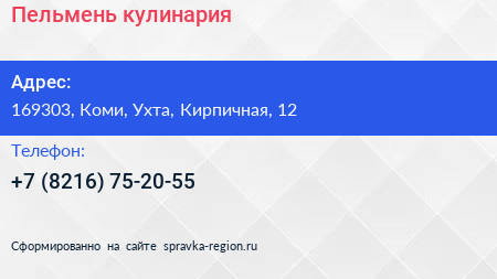 Пельмень, кулинария по адресу 169303, Коми, Ухта, Кирпичная, 12 в дальнейшем Организация, размещена в следующих категориях: