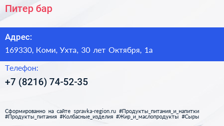 Питер, бар по адресу 169330, Коми, Ухта, 30 лет Октября, 1а в дальнейшем Организация, размещена в следующих категориях: