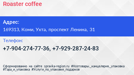 Roaster coffee по адресу 169313, Коми, Ухта, проспект Ленина, 31 в дальнейшем Организация, размещена в следующих категориях: