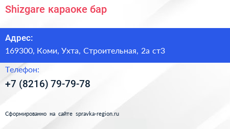 Shizgare, караоке-бар по адресу 169300, Коми, Ухта, Строительная, 2а ст3 в дальнейшем Организация, размещена в следующих категориях: